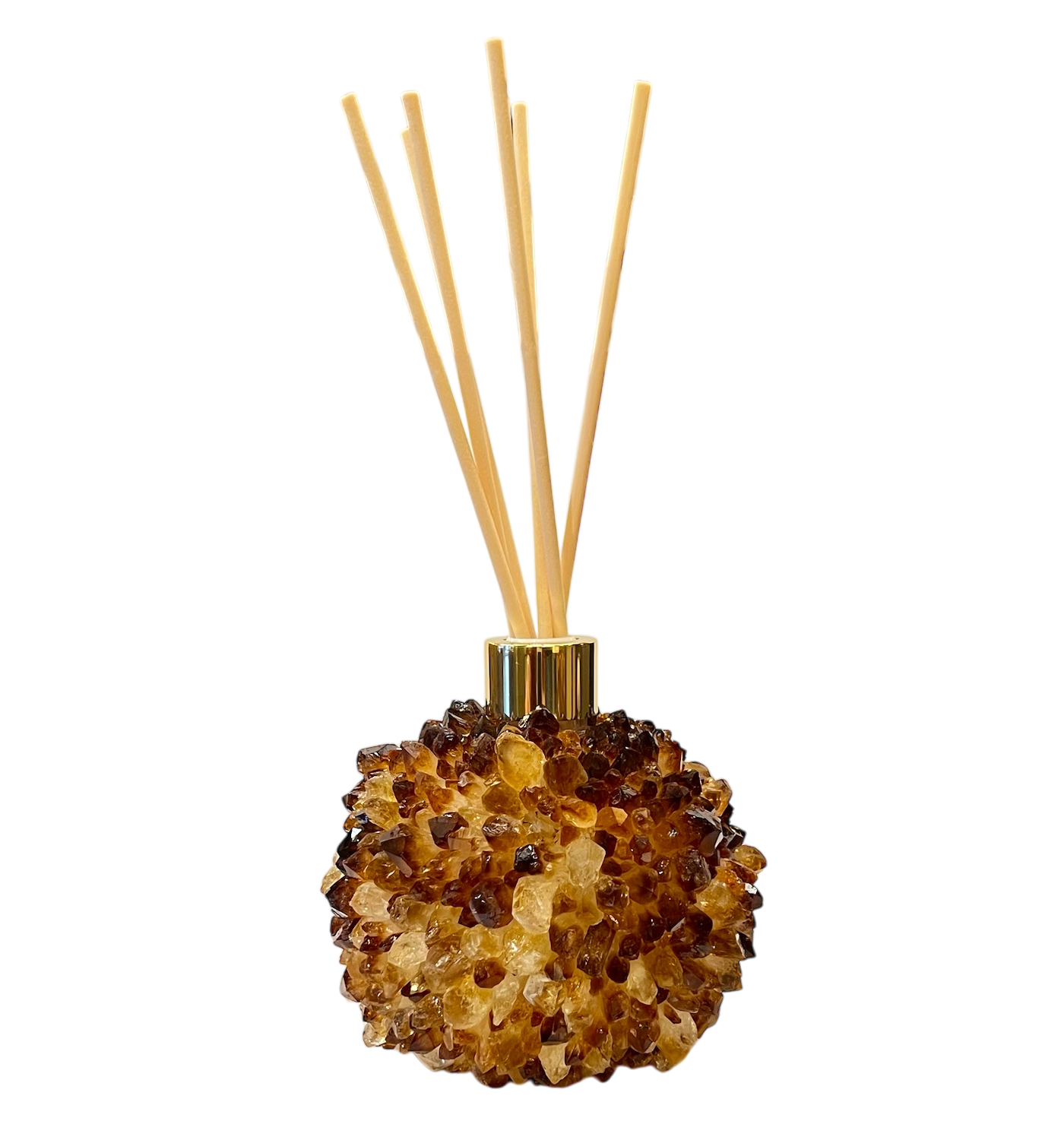 Difusor de aromas em pontas de citrino. Criado com pedra natural e montado artesanalmente, pode conter variações na cor e no formato.