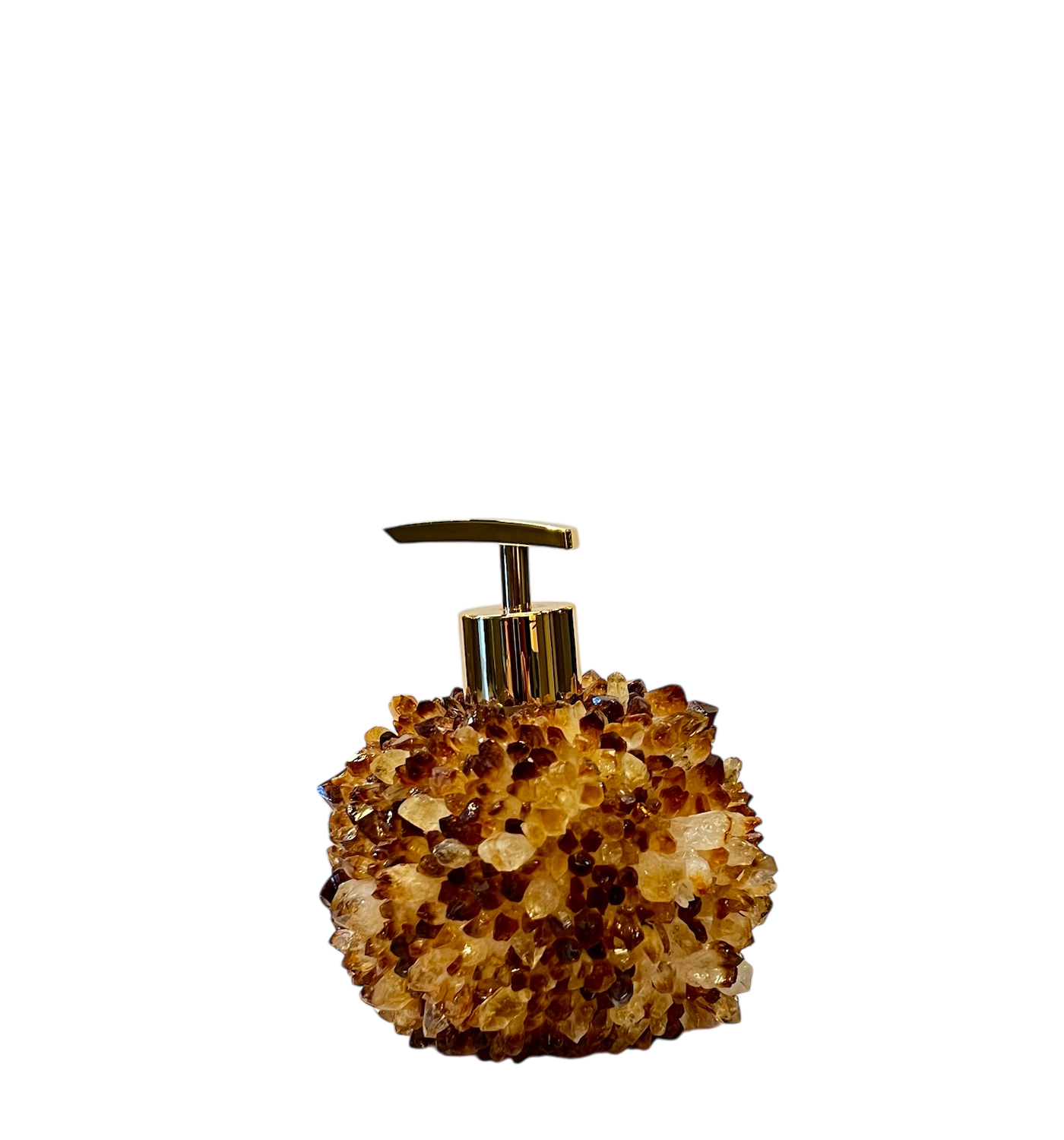 O dispenser de sabonete líquido com pontas brutas de citrino é aquela peça que transforma o lavabo. Criado com pedra natural e montado artesanalmente, pode conter variações na cor e no formato.