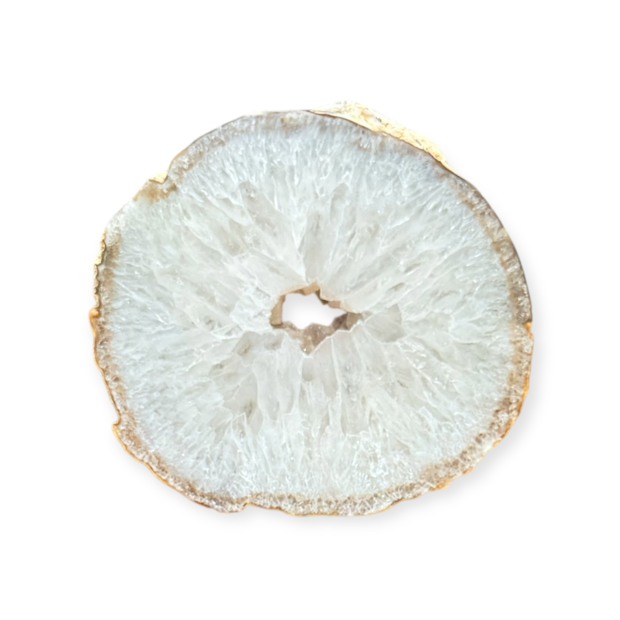 Lâmina grossa de ágata natural brasileira, com interior cristalizado e borda orgânica preservada. A peça revela camadas minerais formadas ao longo do tempo geológico. Predominância de cor branca e núcleo vazado com geodo, que proporcionam leveza visual e fácil integração em composições contemporâneas.