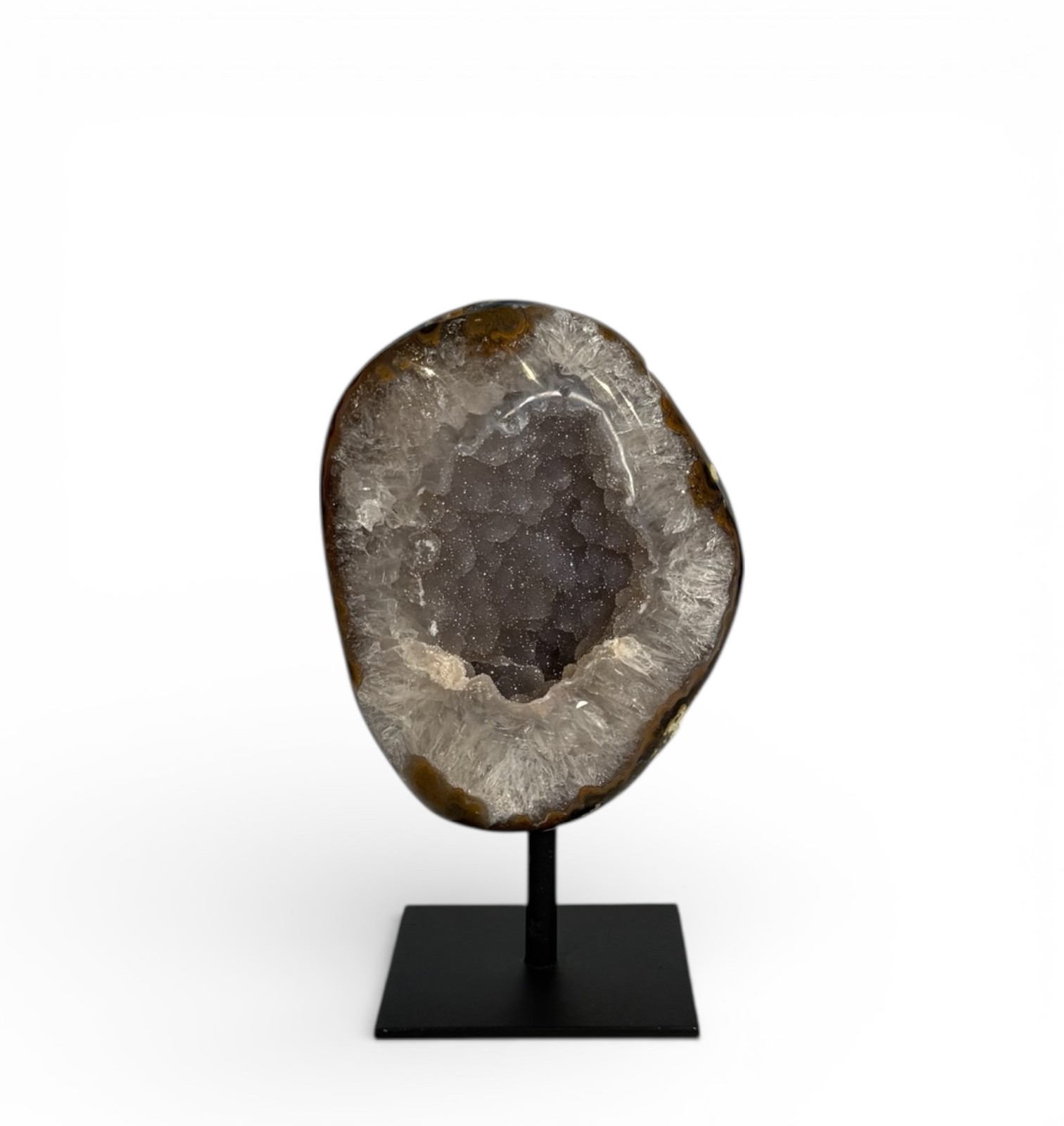 Geodo de ágata natural revelado em corte, evidenciando suas camadas e cristalizações internas.