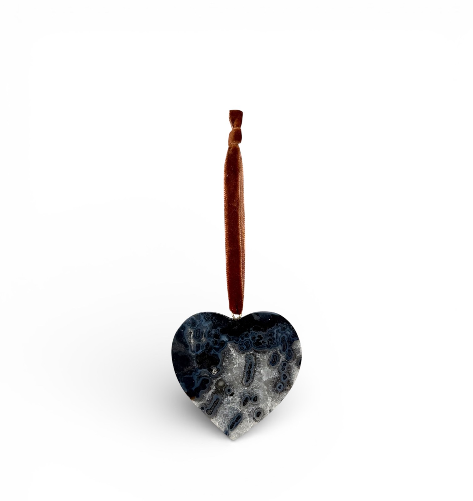 Coleção limitada, cada peça é única. Pingente decorativo em ágata natural lapidada em formato de coração, suspenso por fita de veludo.