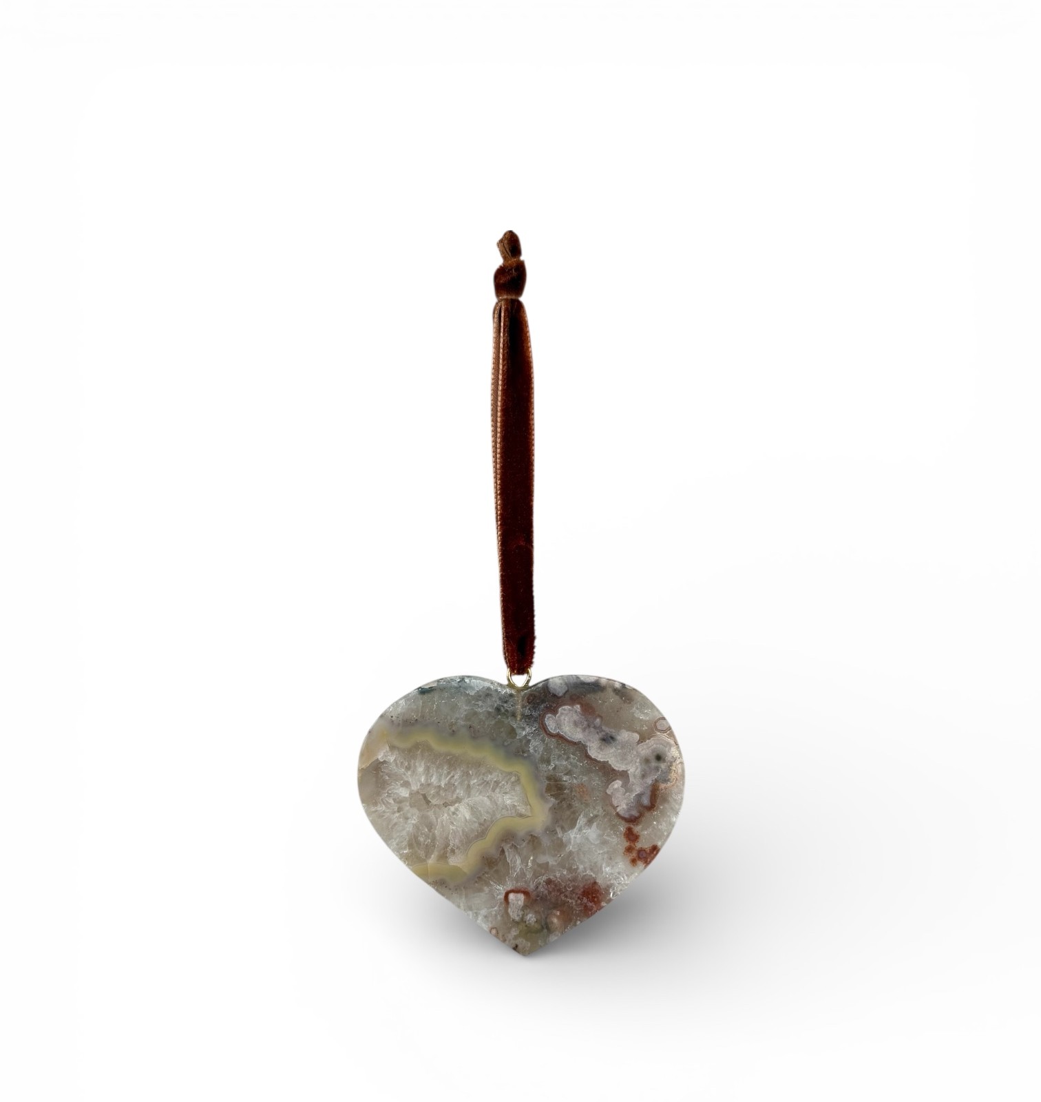 Coleção limitada, cada peça é única. Pingente decorativo em ágata natural lapidada em formato de coração, suspenso por fita de veludo.
