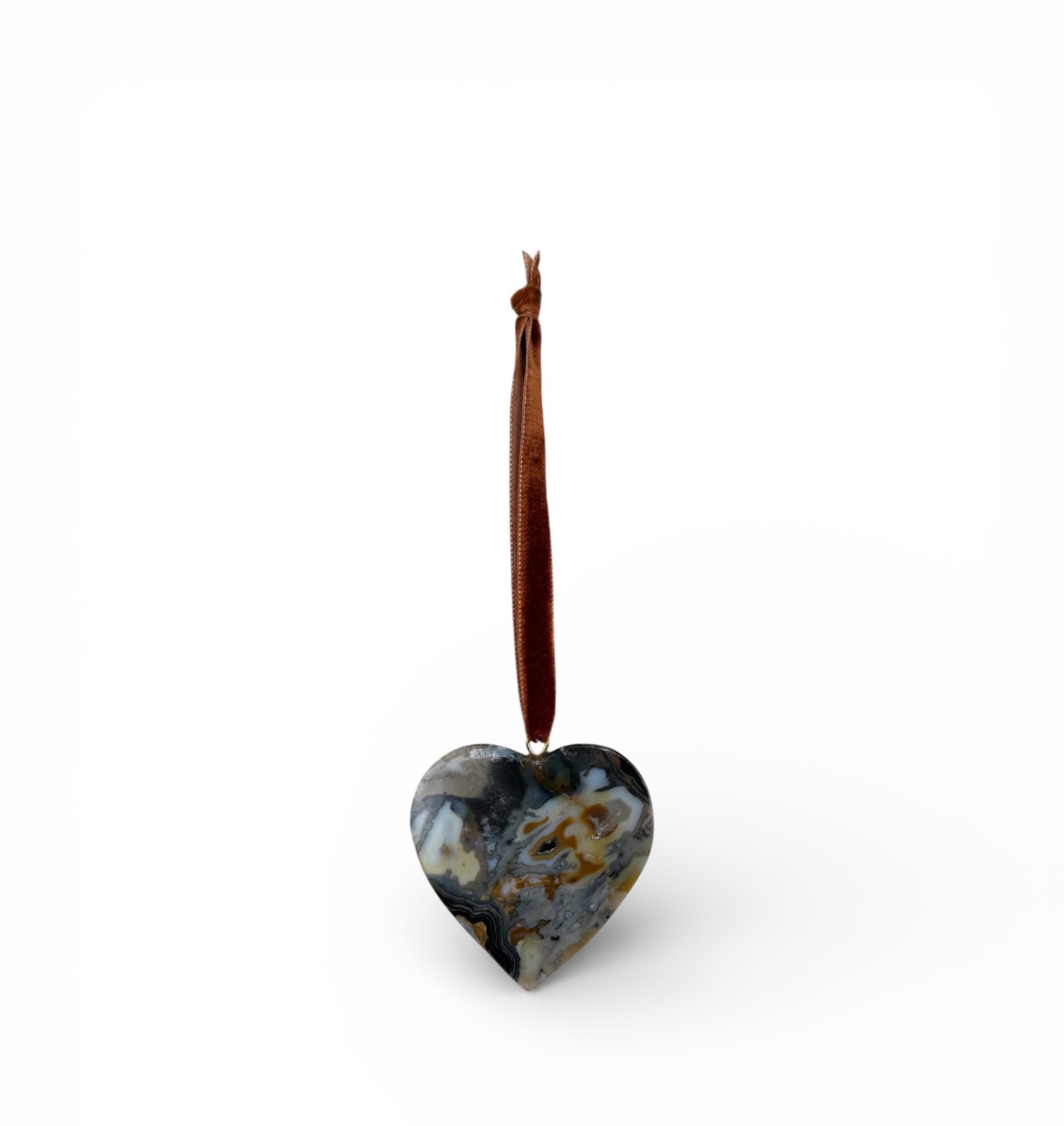 Coleção limitada, cada peça é única. Pingente decorativo em ágata natural lapidada em formato de coração, suspenso por fita de veludo.