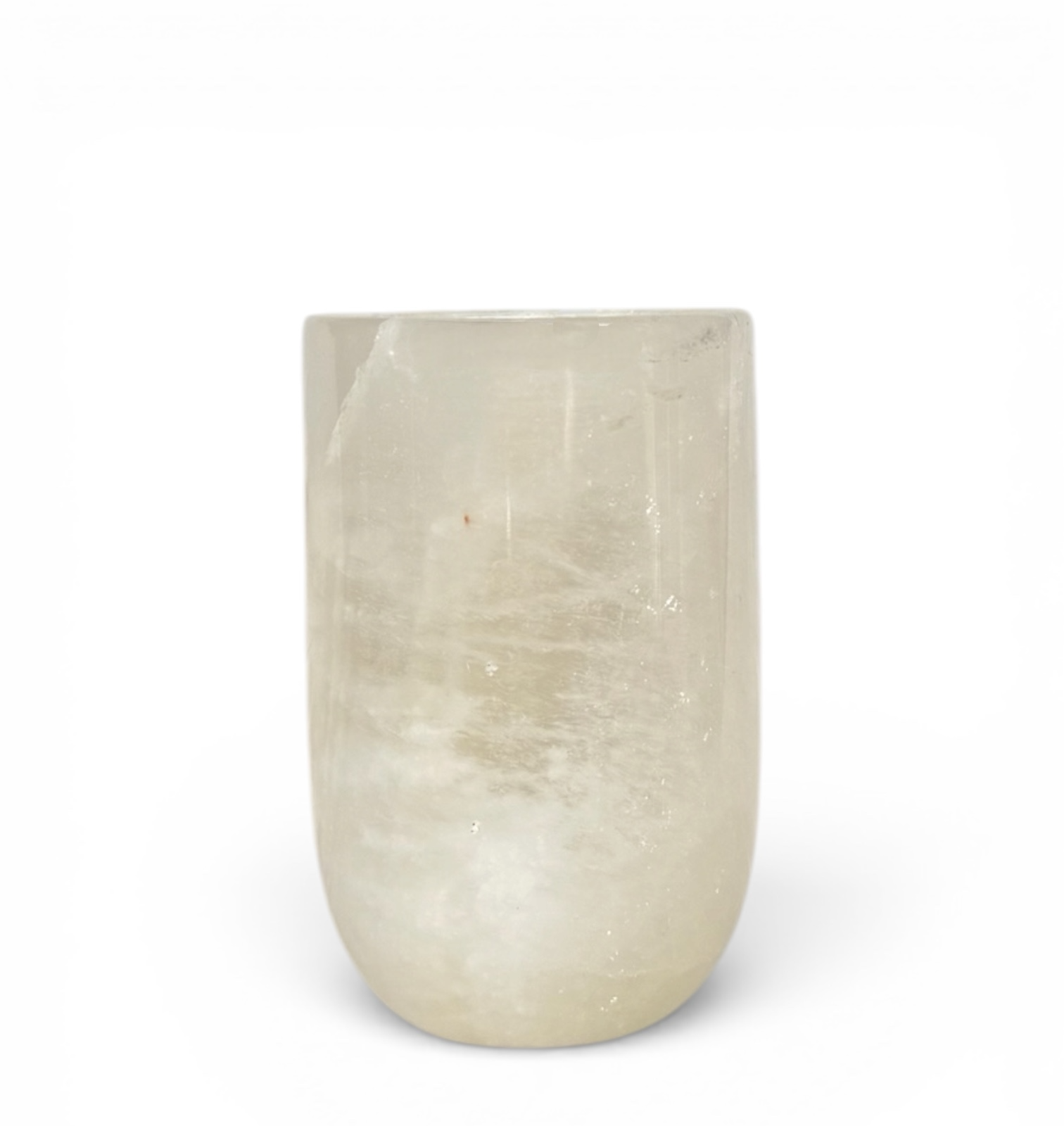 Luz filtrada através da pedra: este vaso em formato copo é esculpido em bloco único de ônix natural paquistanês, conhecida pela sua translucidez característica, que quando iluminada revela veios internos e gradações entre o branco, o creme e o dourado suave. Cada peça é talhada e polida à mão, resultando em um objeto de silhueta limpa e contemporânea, com superfície suave ao toque e textura mineral visível.