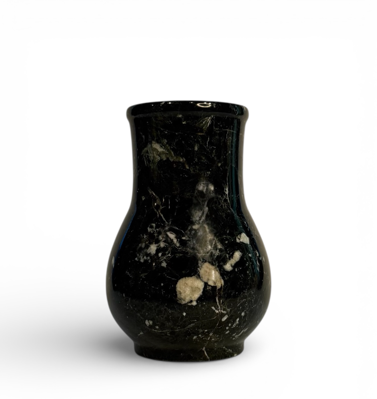Vaso decorativo em ônix preto natural, esculpido e polido a partir de bloco maciço de pedra. A superfície revela veios e inclusões minerais que contrastam com o fundo profundo do ônix, evidenciando sua formação geológica.
